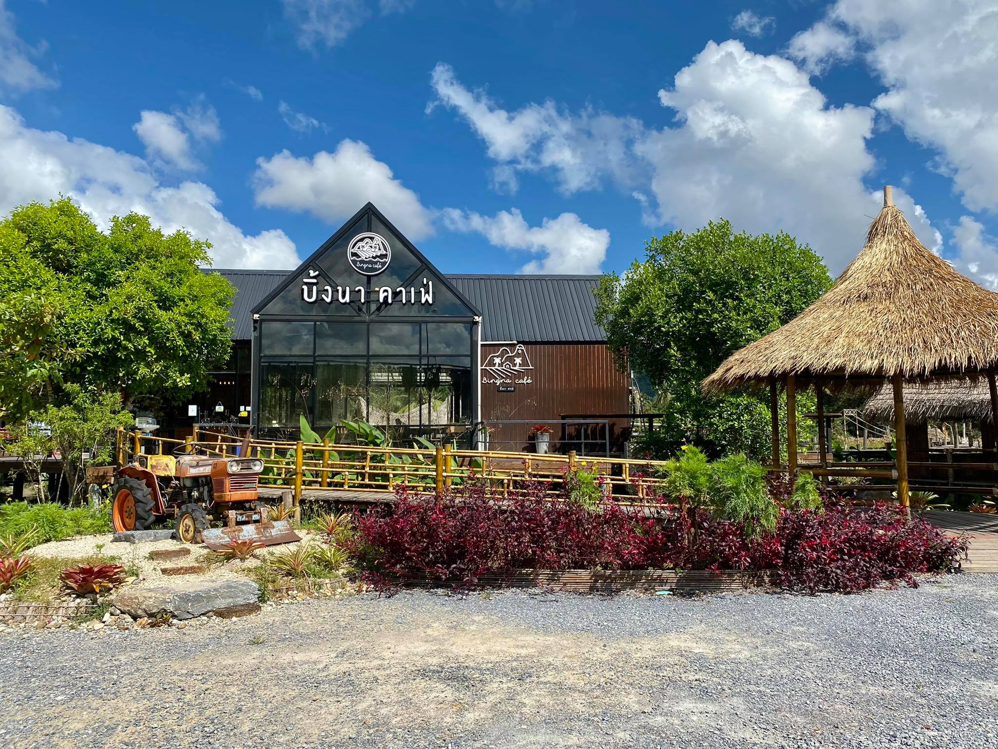 ร้าน “บิ้งนา คาเฟ่” คาเฟ่ริมทุ่งนาเมืองพัทลุง ด้านหน้าและภายในร้านตกแต่งออกสไตล์โมเดิร์น ออกแบบเป็นเรือนกระจกรอบตัวร้าน บรรยากาศโปร่งสบาย ดีไซน์เท่ๆ โซนด้านนอกจะเป็นวิวทุ่งนาให้ได้นั่งชมวิวธรรมชาติสบายตา