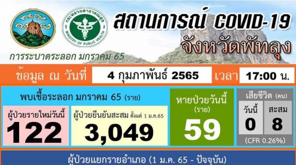 สถานการณ์โรคติดเชื้อไวรัสโคโรน่า 2019 (ระลอกมกราคม 2565) ✏ข้อมูล ณ วันที่ 04 กุมภาพันธ์ 2565 เวลา 17.00 น. ✍ข้อมูล…สำนักงานสาธารณสุขจังหวัดพัทลุง #สำนักงานประชาสัมพันธ์จังหวัดพัทลุง