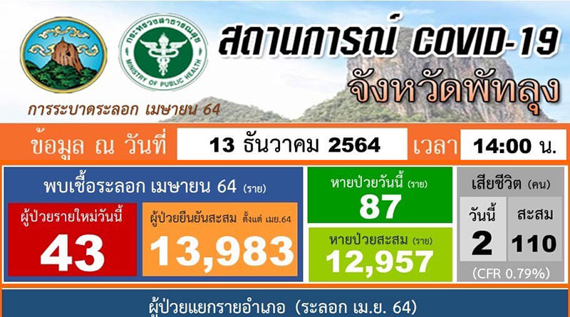 สถานการณ์ COVID-19 จังหวัดพัทลุง ข้อมูล ณ วันที่ 13 ธันวาคม 2564 (14.00 น.)