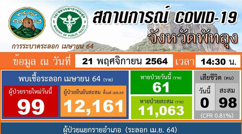 สถานการณ์ COVID-19 จังหวัดพัทลุง ข้อมูล ณ วันที่ 21 พฤศจิกายน 2564 (14.30 น.)